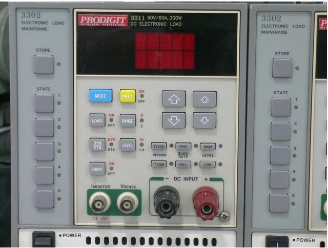 二手电子负载3302C+3311C (60V,60A,300W), 3302C+3312C (250V,10A,300W), 3302C+3315C(60V,15A,75W) 各2套, 及有2个3312C及3315C 150W/300W两种规格具有CCCVCRCP短路及动态测试模式四位半高精度电压电流功率显示带有上下限设定标准配RS-232可选配GPIB ⊙ 適合3310 系列直流負載模組⊙ 適合3320 系列直流負載模組⊙ 適合3250 系列交直流負載模組⊙ 適合3330A 系列直流負載模組⊙ 負載模組彈性安裝組合⊙ 3301A內含五組記憶⊙ 3300C、3302內含150組記憶⊙ 可選用外部呼叫記憶鍵⊙ AC-DC 電源供應器⊙ DC-DC 轉換器⊙ DC-AC 轉換器⊙ 電池放電⊙ 電池充電器⊙ 功率零組件3300C為1200W機框適合安裝任何組合的3310/3250/3330A系列負載模組。3301A 為1200W機框 適合安裝任何組合的3320系列負載模組。3302為300W機框適合安裝任何單個3310/3320/3250/3330A系列負載模組。3300系列機框上之記憶按鍵或遙控按鍵,提供方便之單鍵操作便可立即呼叫出所有負載模組的預先儲存狀態 ; 僅需一個GPIB地址便可遙控所有的負載模組。