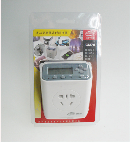 *额定电流:AC 10A *额定电压:220V *额定功率:2500W *USB充电电压:5V *USB充电电流:≤1A *使用温度范围:0℃~40℃ *可编程数:20组/天 *循环周期:7天 *绝缘电阻:>100MΩ *时间设定范围:每星期或每日按设定的程序循环工作,1分~168小时 *固有损耗:<0.5W *开关小间隔:1分钟 *产品插头:国标10A,三角插头