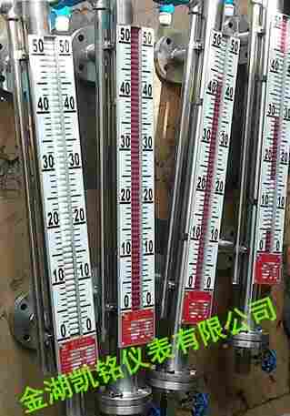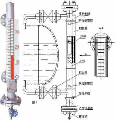 液位计根据浮力原理,浮子在测量管内随液位的升降而上下移动,浮子内的磁钢通过磁耦合作用,驱动红、白色翻柱翻转180’液位上升时,翻柱由白色转为红色,下降时,翻柱由红色转为白色,从而实现液位的指示。