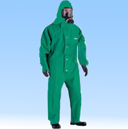 绿色PVC带衬防化服。符合EN465标准。拉链上有两个重叠的遮盖,并有5个钮扣保护,防化效果好。 接缝为缝线和超声波焊接,加强了防护效果。 具有强的耐磨性能。可有效防酸,碱,有限防油,脂和防苯性能。 化学性能符合EN 465(如下) 试剂 级别 时间 96%硫酸 3 1小时18分 冰醋酸 3 1小时4分 二甲苯 1 12分钟 机械性能符合EN 465(如下) 耐磨性 等级6 热稳定性 等级2 耐屈挠龟裂性 等级4 抗刺穿性 等级5 抗撕裂性 等级5 涂层附着强度 等级5 接缝强度 等级5 所有测试执行机构为:SGS,YARSLEYI,C,S.,Camberley,Surrey GU15 3EY。实体编号:0120。