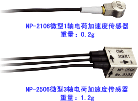 体积小重量轻的微型轻量压电式电荷加速度传感器NP-2106(1轴),NP-2506(3轴)2型号。适用于便携式产品跌落评价试验,轻量物品的振动测量。