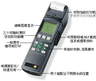 记忆空间 (基本版本): 15 KB大约 7500 个读数记忆空间: 可多至1MB, 大约500,000个读数其它特点: 自动识别所有连接的探头电力供给: 电池/充电池,或8V充电器2 个热电偶保持电池正常操作探头保养期: 1 年